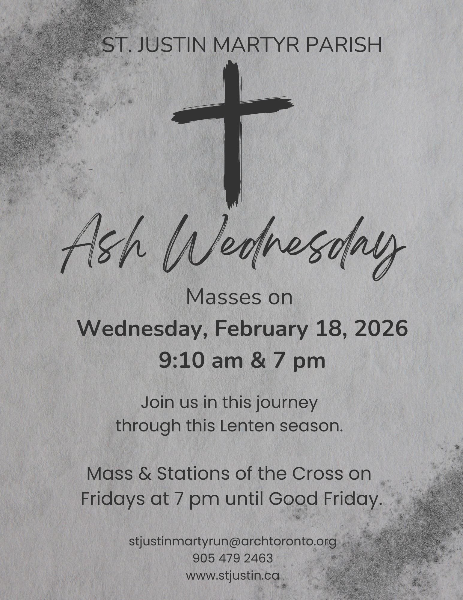 St. Justin Martyr Parish celebrates Ash Wednesday Masses on Wednesday, February 18, 2026 9:10 am & 7 pm. We remind all faithful that Ash Wednesday is a day of fasting (only one full meal) for Catholics (ages 18 to 59 years) and abstinence from meat (ages 14 and up).