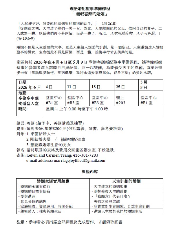 Inquiry 查詢:Kelvin and Carmen Tsang: 416-301-7283email address 電郵: marriagejoyfilled@gmail.com
